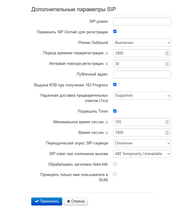 Укажите SIP-домен (при необходимости) в блоке параметров «Дополнительные параметры SIP». Для использования доменного имени при регистрации установите флаг «»: