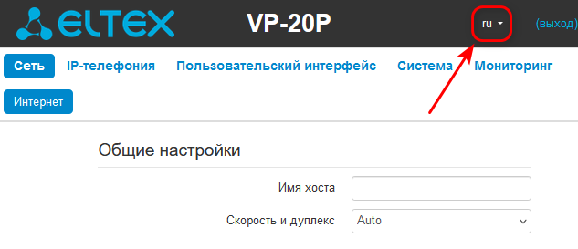 В верхнем правом углу, при необходимости, возможно сменить язык web-интерфейса на нужный: