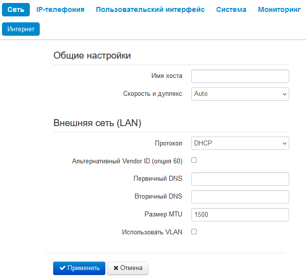 В поле «Протокол» выберите протокол, используемый вашим поставщиком услуг Интернет, и введите необходимые данные согласно инструкциям провайдера. Если для подключения к сети провайдера используются статические настройки, то в поле «Протокол» нужно выбрать значение «Static», заполнить поля «IP-адрес», «Маска подсети», «Шлюз по умолчанию», «Первичный DNS» и «Вторичный DNS» — значения параметров предоставляются провайдером.