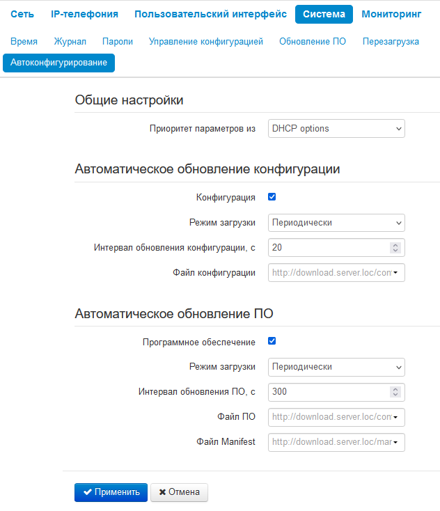 Если выбрано значение «Static settings», то из параметров «Файл конфигурации» и «Файл ПО» определяется полный путь (включая протокол доступа и адрес сервера) к файлам конфигурации и программного обеспечения. Полный путь указывается в формате URL (поддерживаются протоколы HTTP, HTTPS, FTP и TFTP):