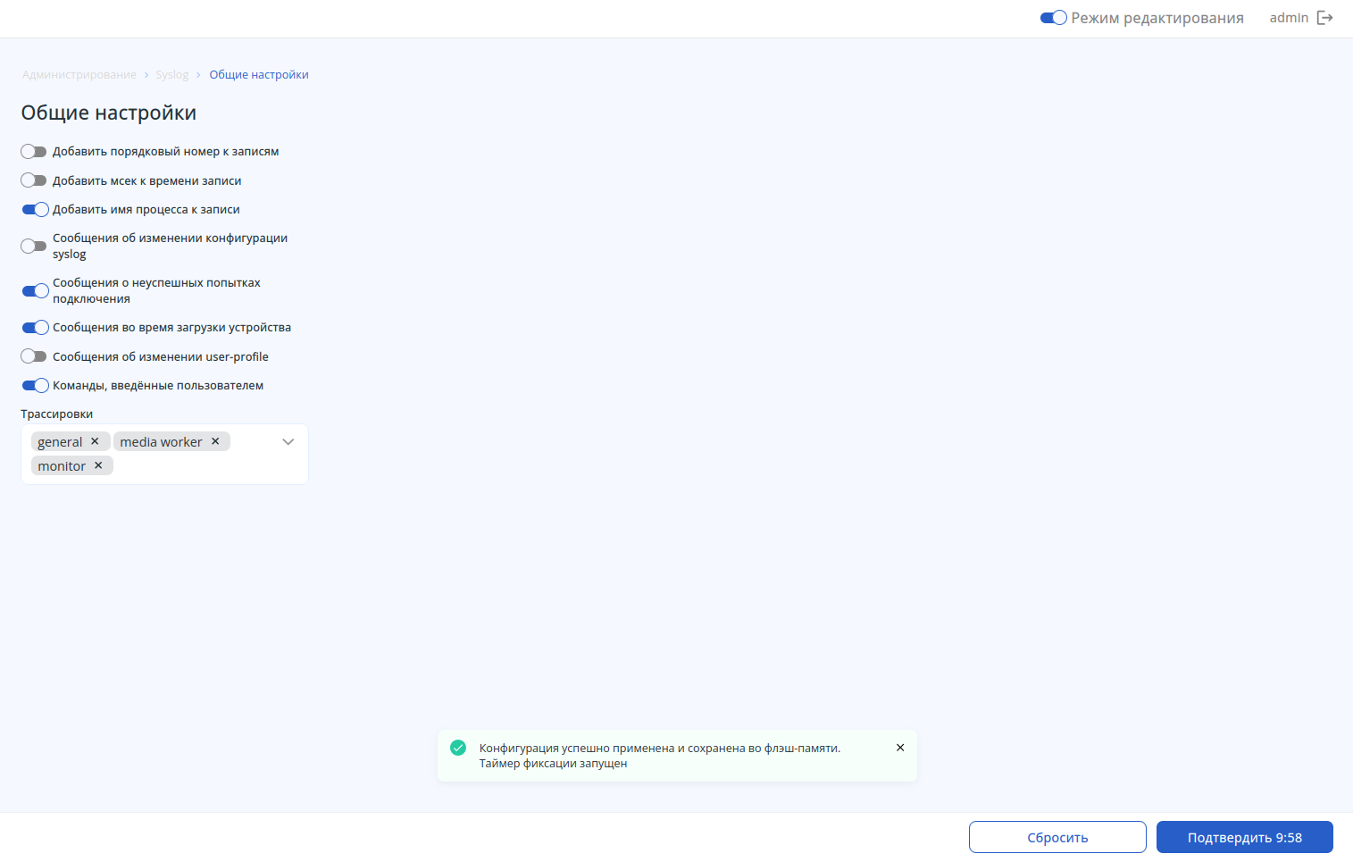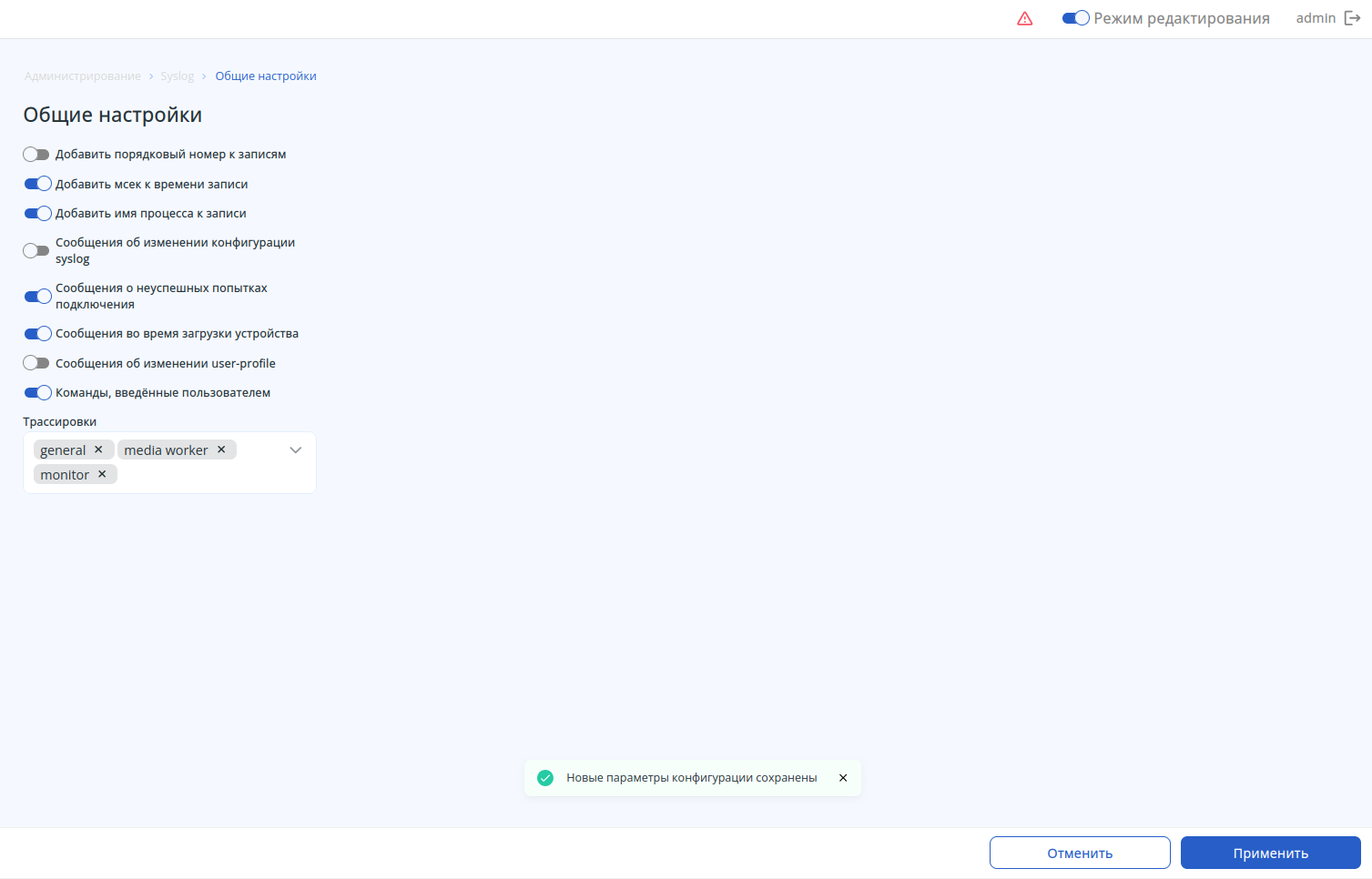 • Сообщения об изменении конфигурации syslog – включается запись сообщений об изменении конфигурации syslog;