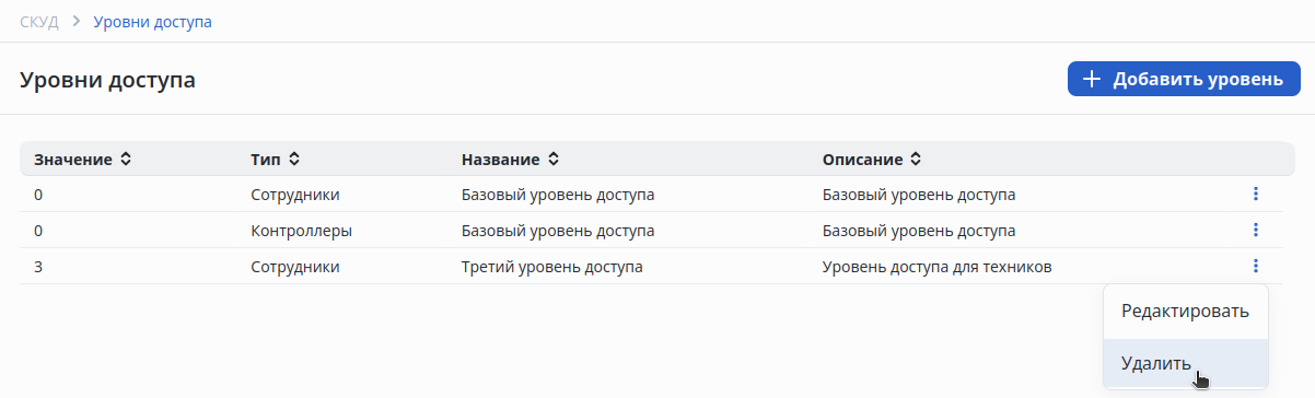 В разделе СКУД перейдите на страницу Уровни доступа