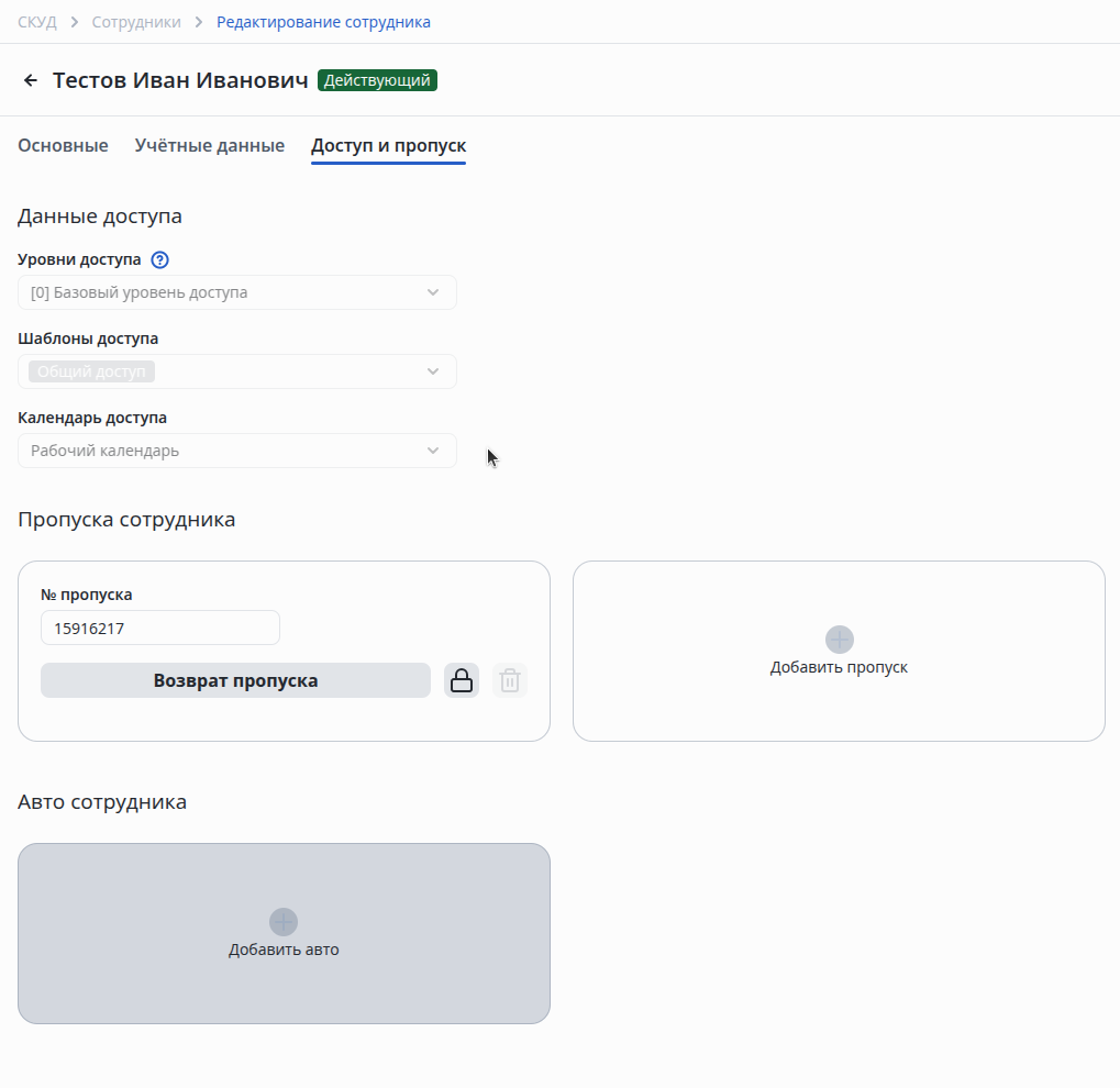 - Просмотр вкладки Учётные данные в карточке сотрудника;