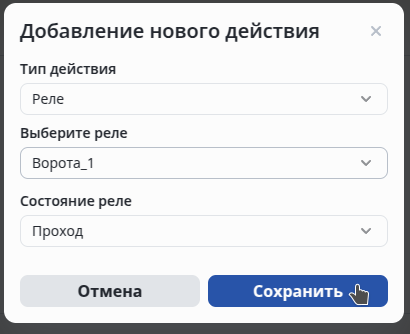 Далее выберите тип действия — Реле, нужное реле из списка и состояние  реле — Проход/Включить/Выключить.