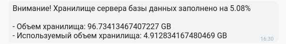USED_SPACE_REPORTER_PERCENT_LIMIT — процент заполненности диска, при достижении которого начинают отправляться уведомления. По умолчанию равен 85. При заполненности диска менее указанного процента, отчеты о заполненности приходить не будут.
