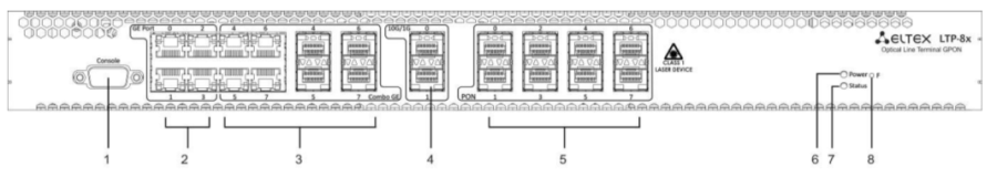 8 | Combo GE | 0..3 | 4 шасси для установки SFP-модулей 1000BASE-X uplink-интерфейса для выхода в IP-сеть (для LTP-4X) |