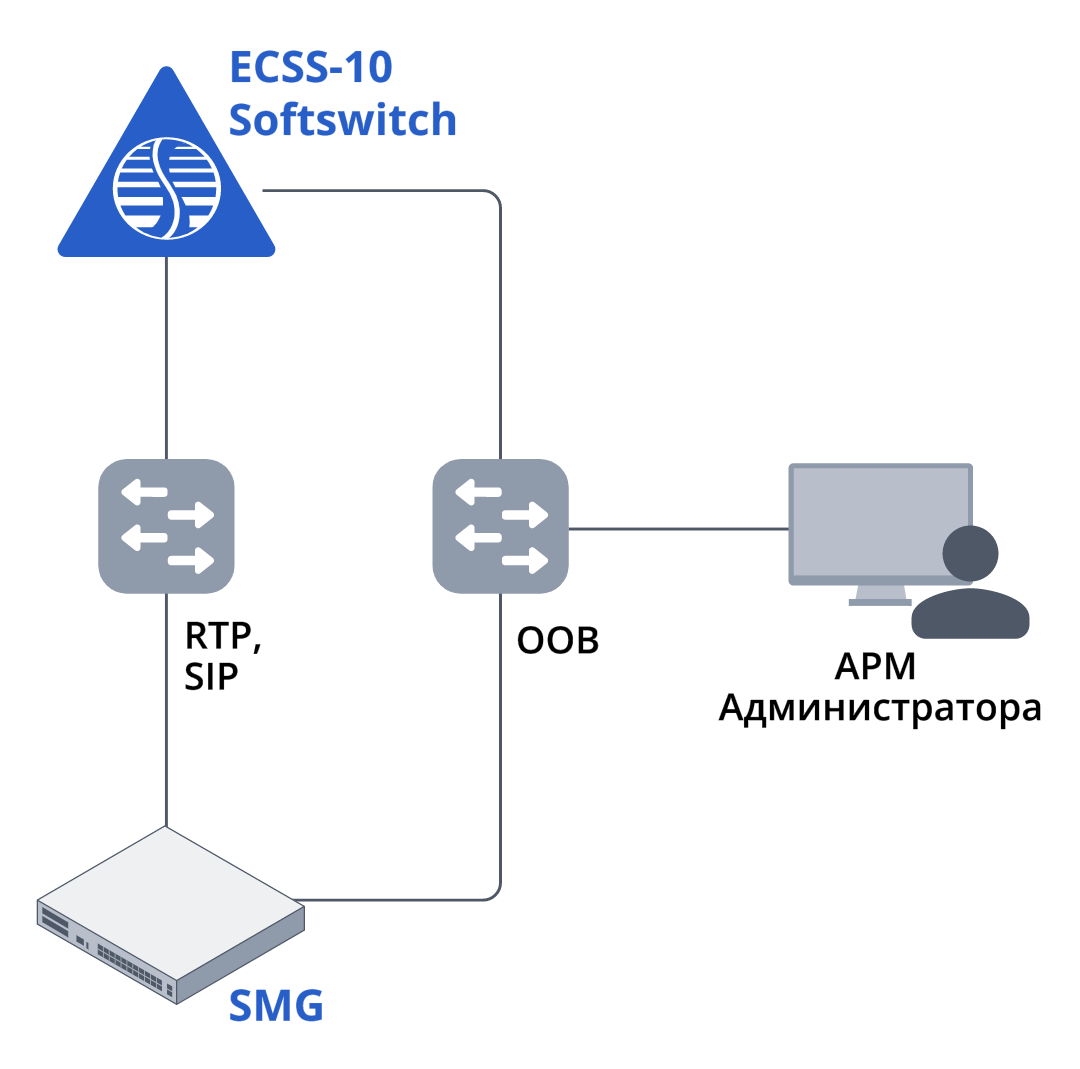 Шлюзу SMG необходим доступ до серверов IP АТС ECSS-10 Softswitch по протоколам SIP и RTP. Эту связь можно организовать в одном или двух разных VLAN. Управление рекомендуется выносить в отдельную сеть. Для управления на SMG-3016 имеется отдельный порт OOB.