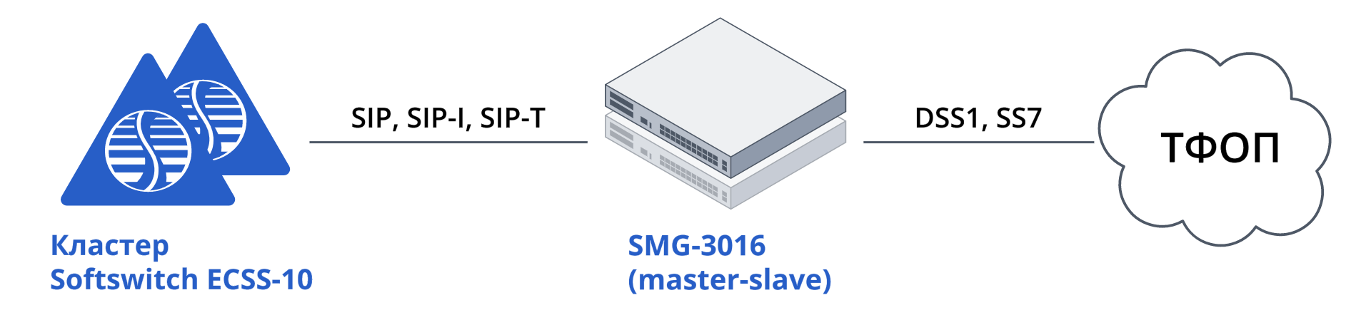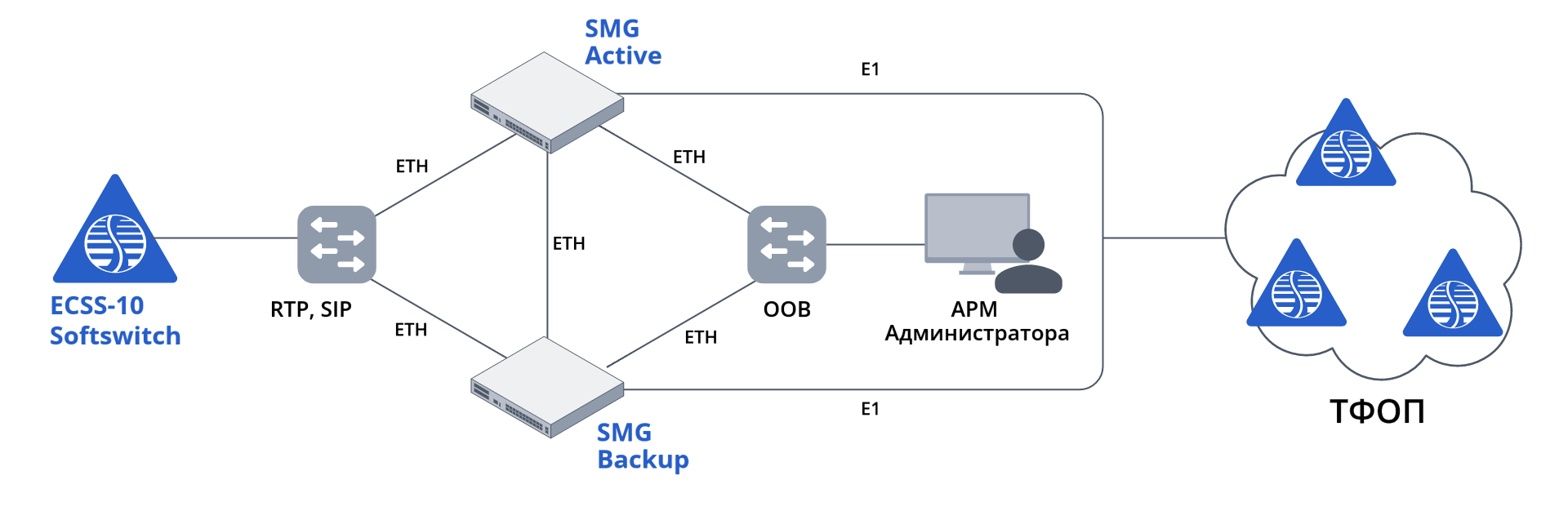 Транковые шлюзы SMG подключаются к IP АТС ECSS-10 Softswitch через сеть передачи данных, по протоколу SIP. SMG через интерфейсы E1 подключается к оборудованию противоположной стороны.