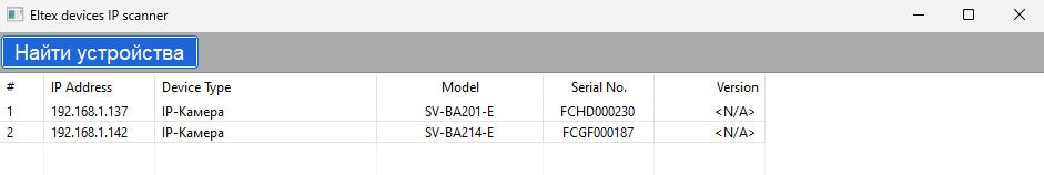 Чтобы обнаружить в сети камеры видеонаблюдения производства Eltex, запустите приложение. Откроется окно со списком камер. В списке отображены все ваши камеры в локальной сети: