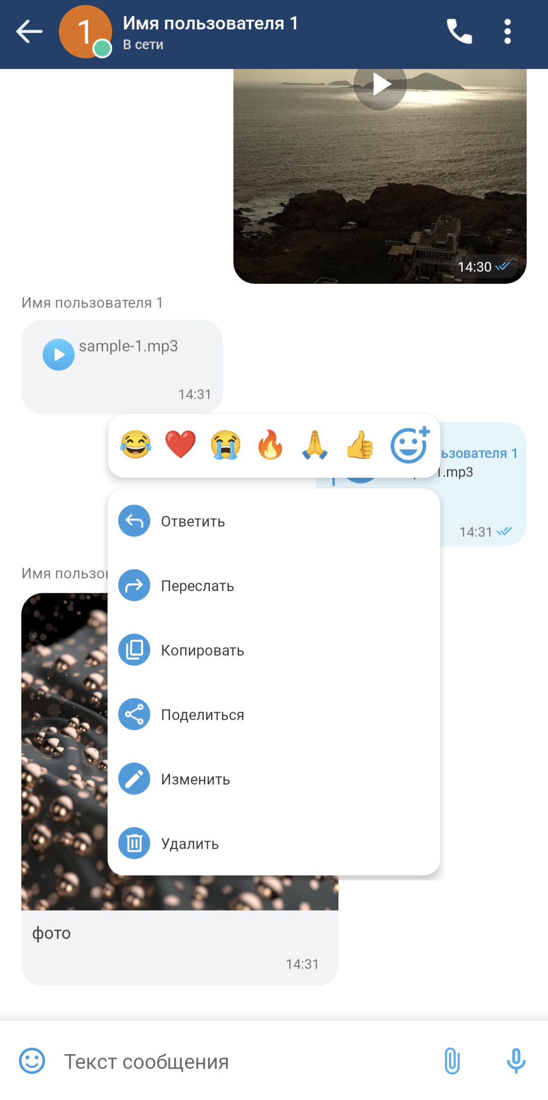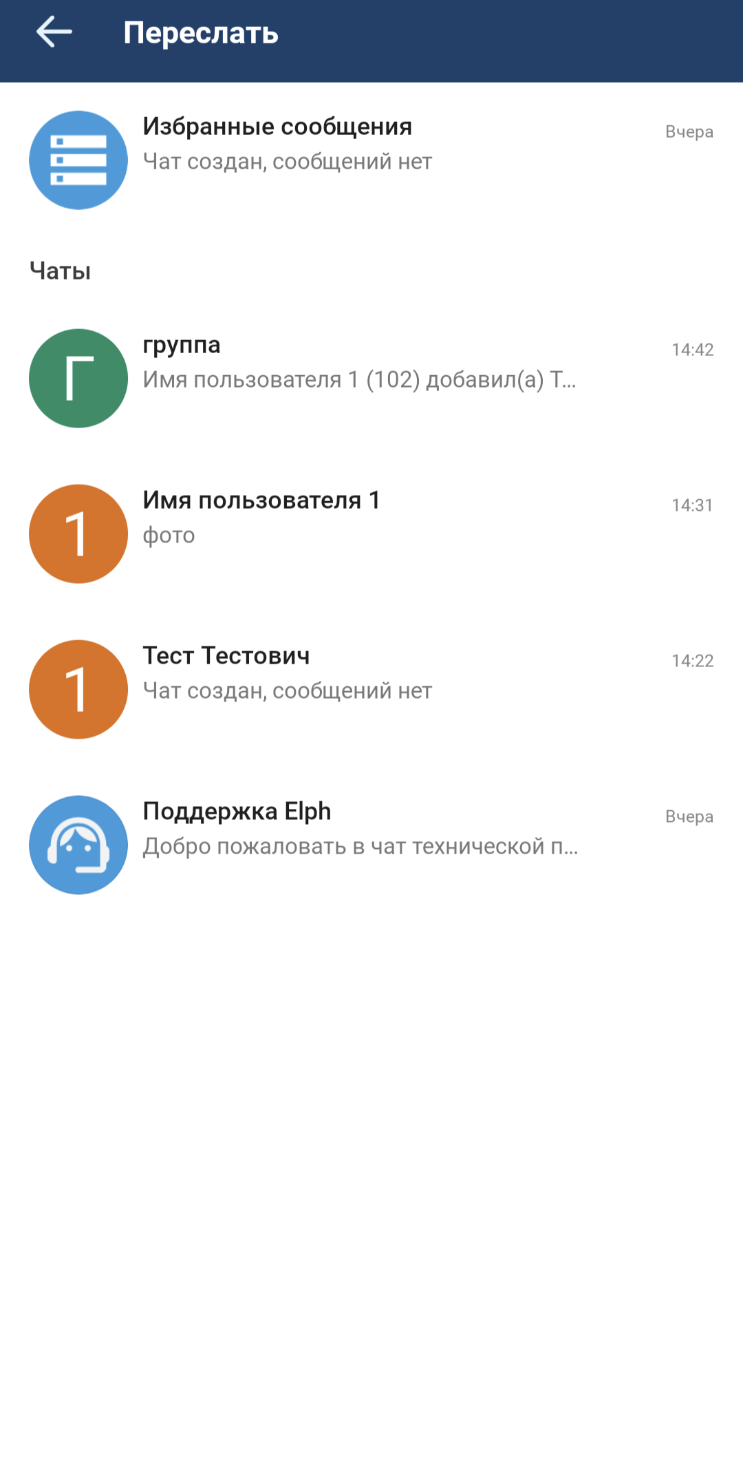 Для пересылки сообщения необходимо в контекстном меню выбрать «Переслать». В этом случае откроется список чатов, при нажатии на один из них сообщение будет переслано в данный чат.