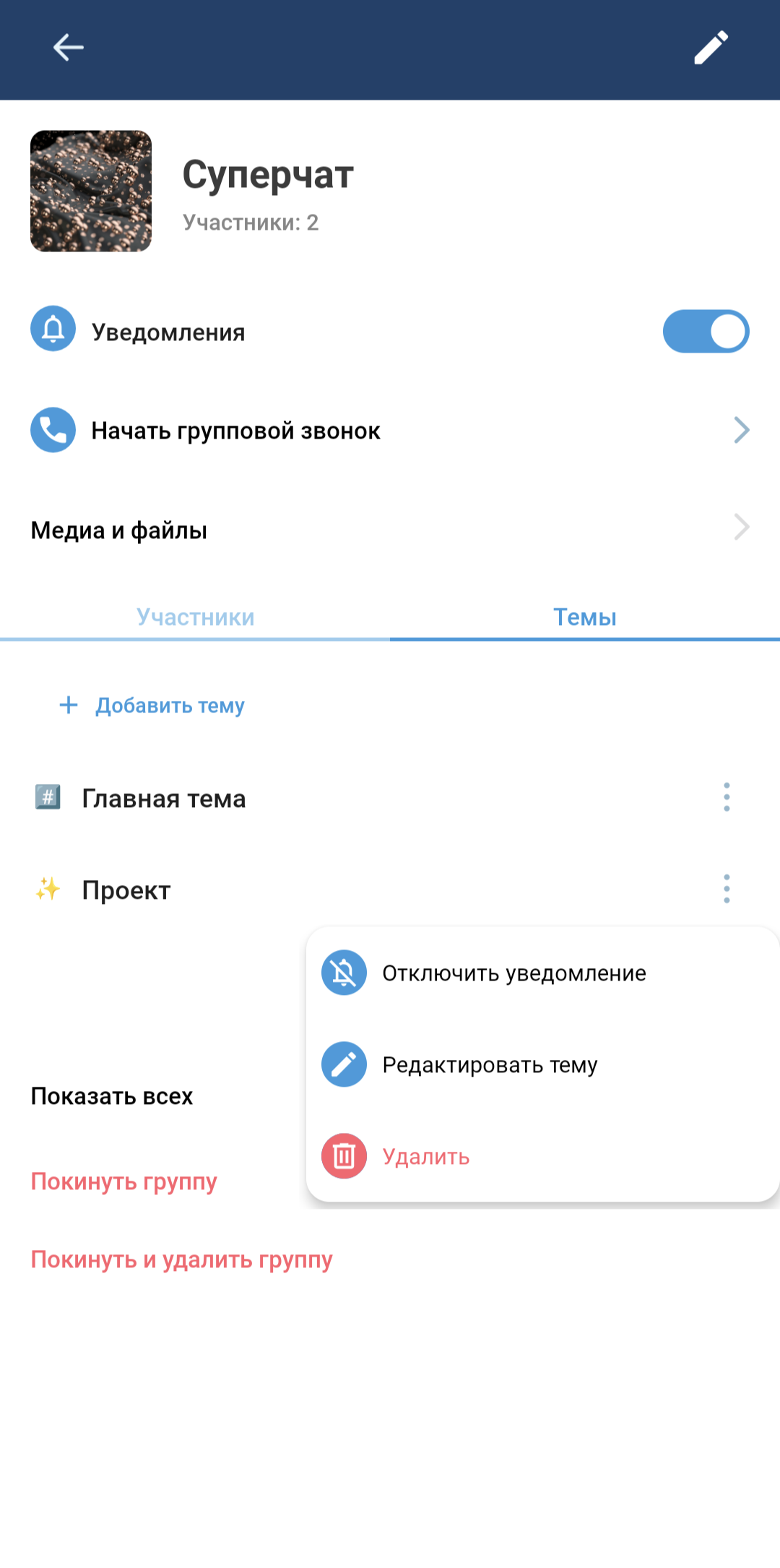 Редактирование и удаление темы в суперчате