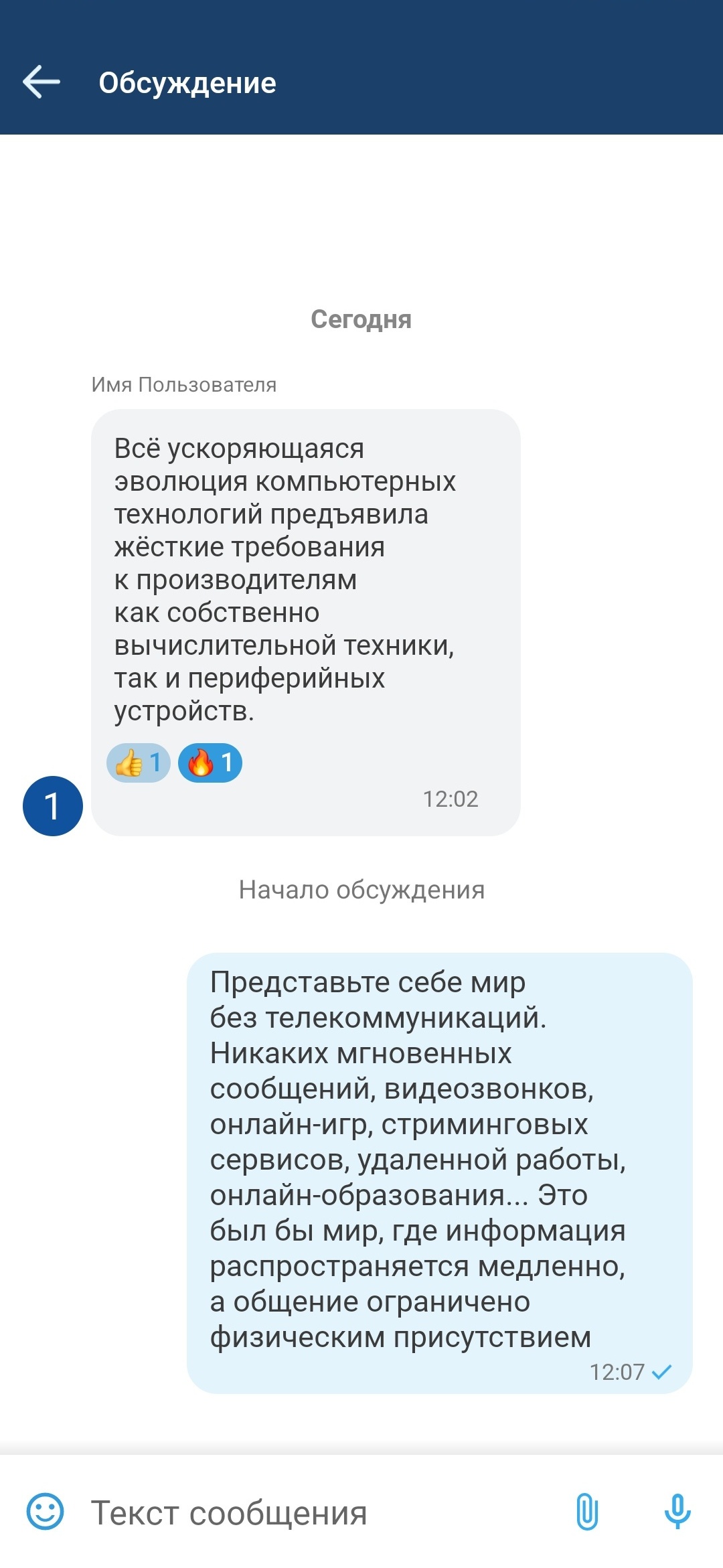 Для создания треда под сообщением в групповом чате необходимо в контекстном меню выбрать «Обсудить». Откроется экран с обсуждением, где доступен базовый функционал переписки и постановки реакций.