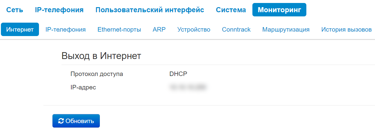 В подменю «IP-телефония» осуществляется просмотр состояния сетевого интерфейса VoIP и мониторинг аккаунтов.