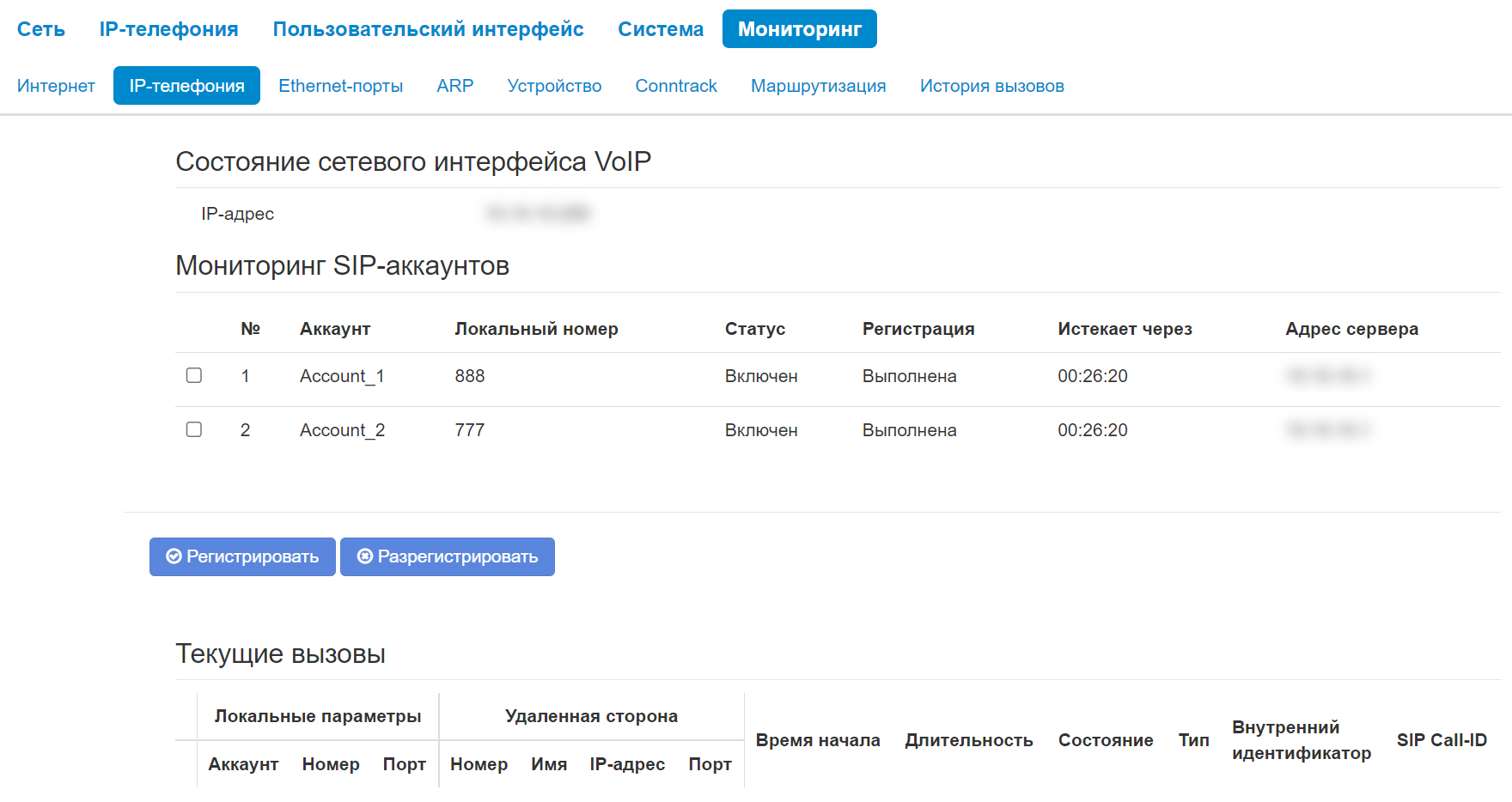 Под таблицей Мониторинга SIP-аккаунтов находятся кнопки для принудительной регистрации или отмены регистрации выбранных аккаунтов.