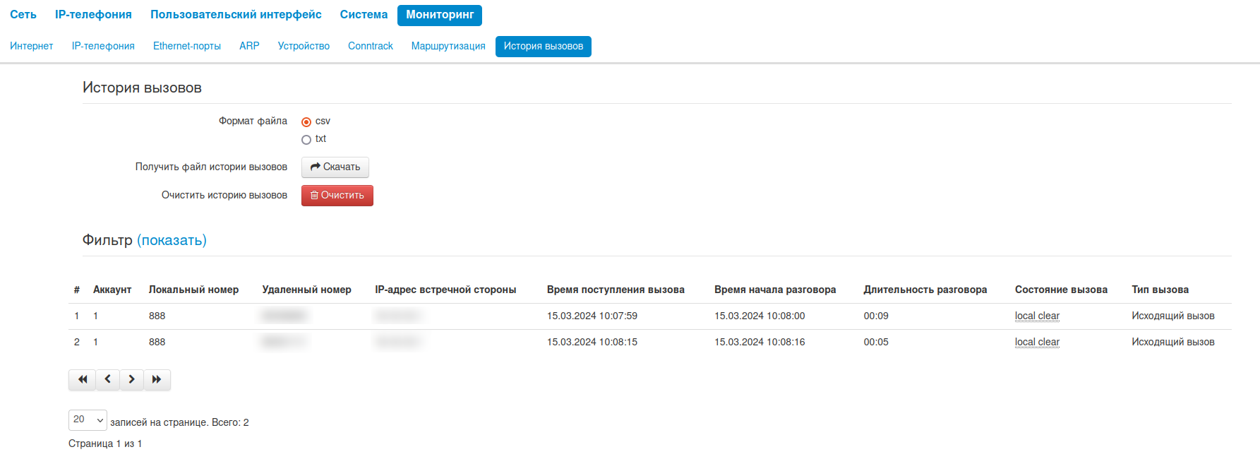 - Получить файл истории вызовов — для сохранения файла «voip_history» на локальном ПК выберите формат файла csv или xml и нажмите на кнопку «Скачать»;