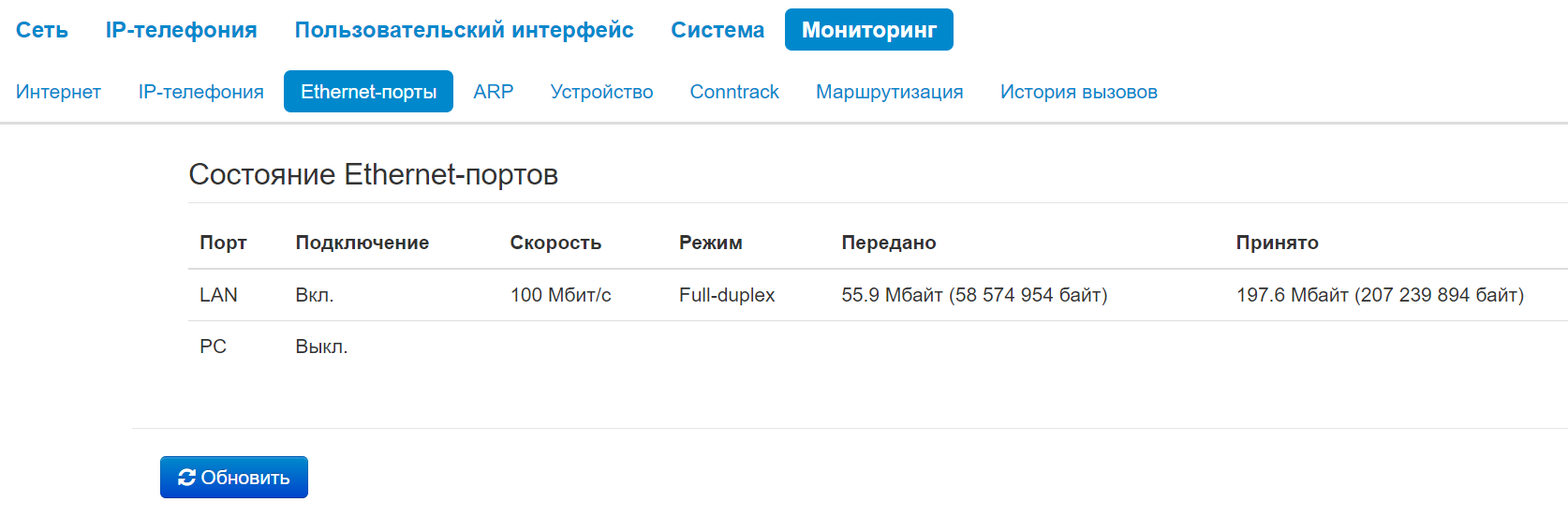 Для получения текущей информации о состоянии Ethernet-портов и обновления значения счетчиков и переданных байт нажмите кнопку .