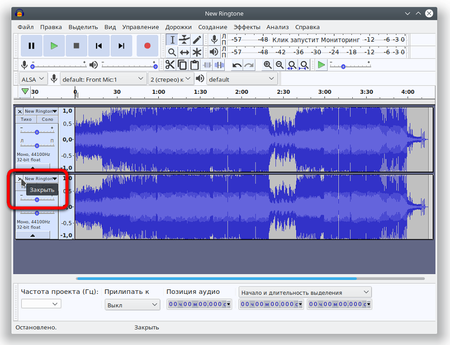 - Уберите одну из дорожек. Для этого нажмите кнопку «Закрыть» в панели управления.