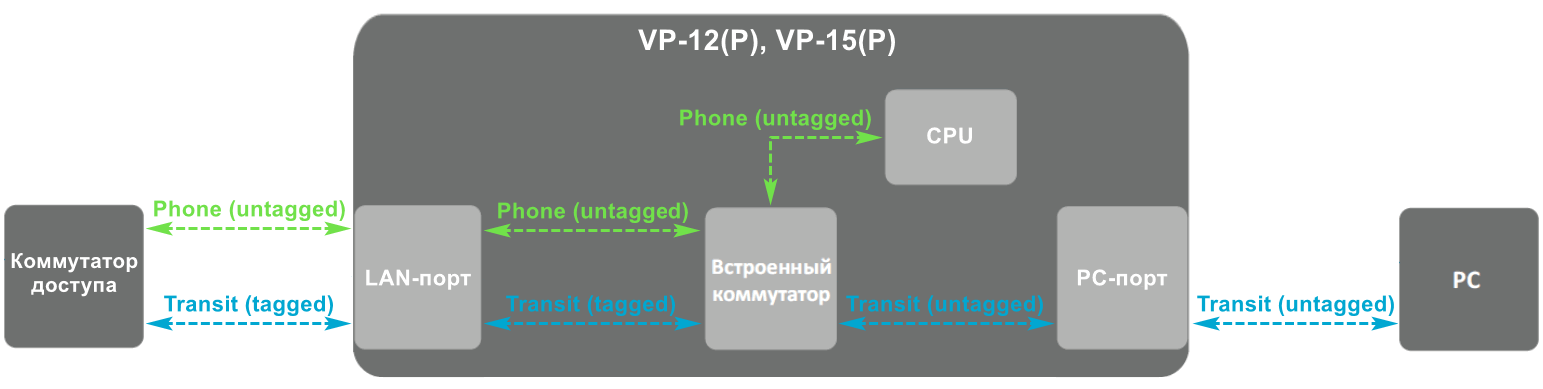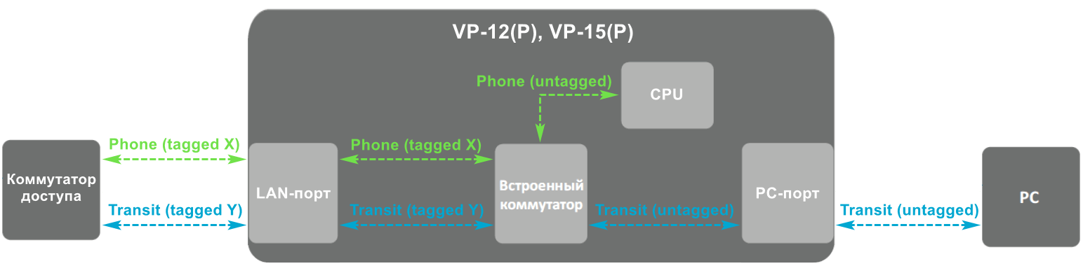 ПК, подключенный к порту PC, имеет нетегированный трафик при любой настроенной схеме. При активированном VLAN для транзитного трафика на нетегированный трафик от ПК при прохождении через телефон появится тег, а при прохождении через телефон в обратную сторону тег снимется.