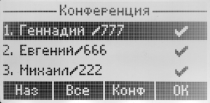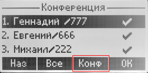 Клавишей <ОК> выбрать необходимых абонентов, или, если необходимо добавить всех, нажать клавишу <Все>. После чего нажать клавишу <Конф> — конференция собрана. В данном случае, чтобы при нажатии клавиши «Конф» произошел сбор конференции, нужно выбрать не менее двух абонентов из списка.