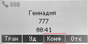 2. Во время активного вызова, когда на удержании есть один вызов (помимо активного), нажать клавишу <Конф> — конференция собрана;