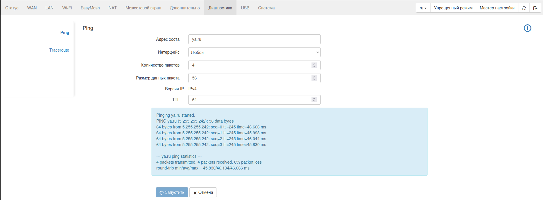- Перейдите во вкладку "Диагностика", подменю "Ping". В поле "Адрес хоста" необходимо ввести адрес "1.1.1.1" и нажать кнопку "Запустить". На странице должен отобразиться результат аналогичный изображению ниже: