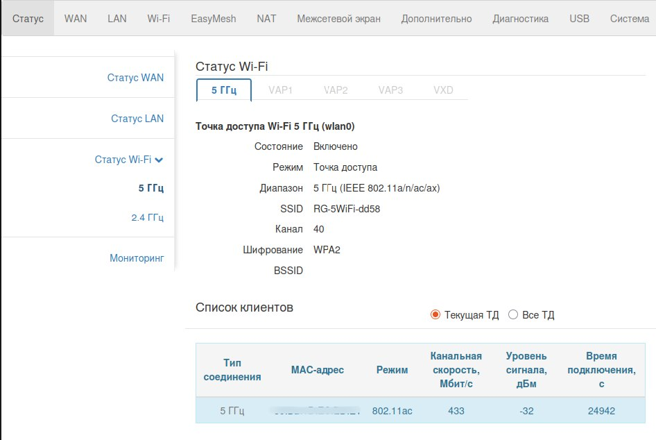 - Перейдите во вкладку "Статус Wi-Fi", подменю 2.4 ГГц/5 ГГц (в зависимости от используемого диапазона).