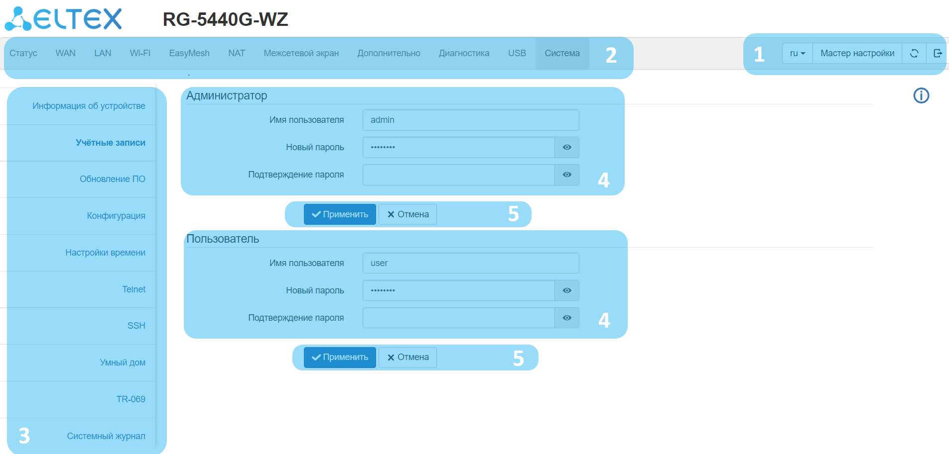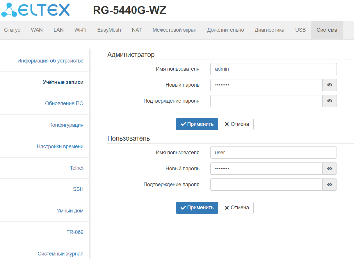 В подменю «Учётные записи» устанавливаются имя пользователя и пароль доступа к web-интерфейсу устройства для учётных записей admin и user.