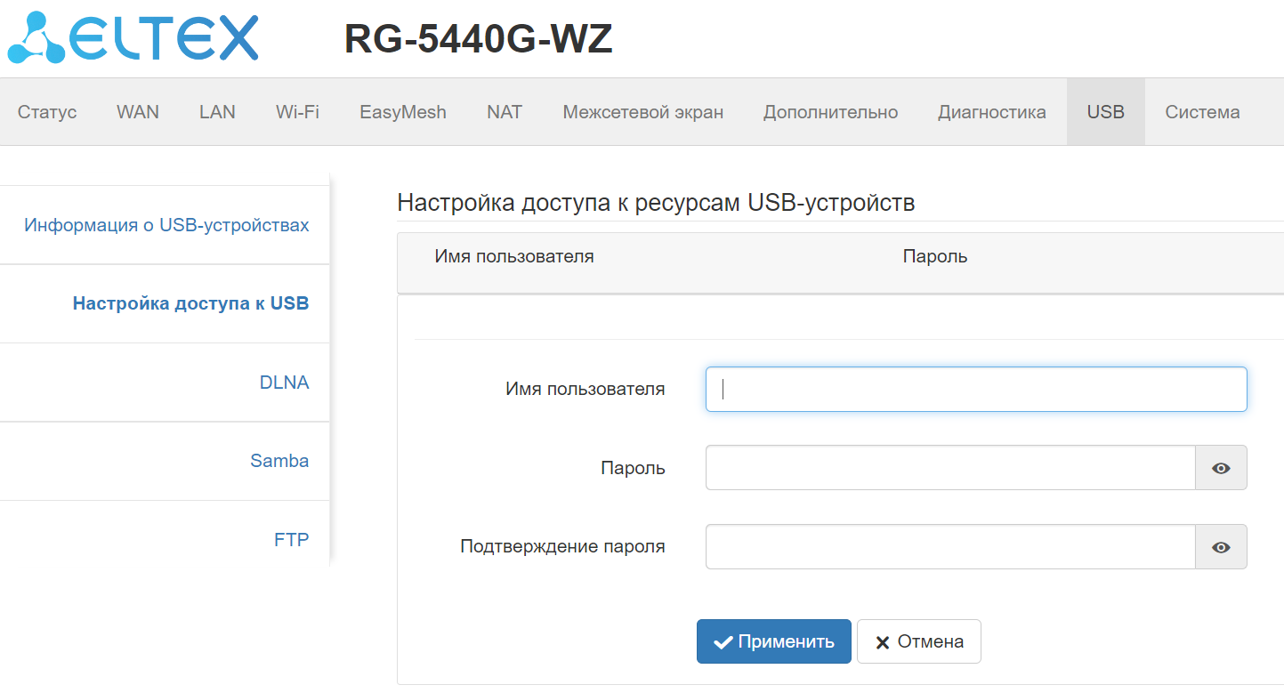 В этом подменю выполняется создание пользователя для доступа к ресурсам на USB.