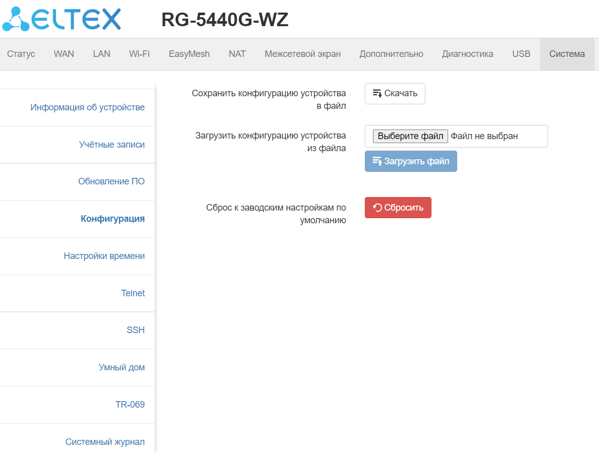 Сохранить конфигурацию устройства в файл — для сохранения текущей конфигурации устройства на локальный компьютер нажмите кнопку «Скачать».
