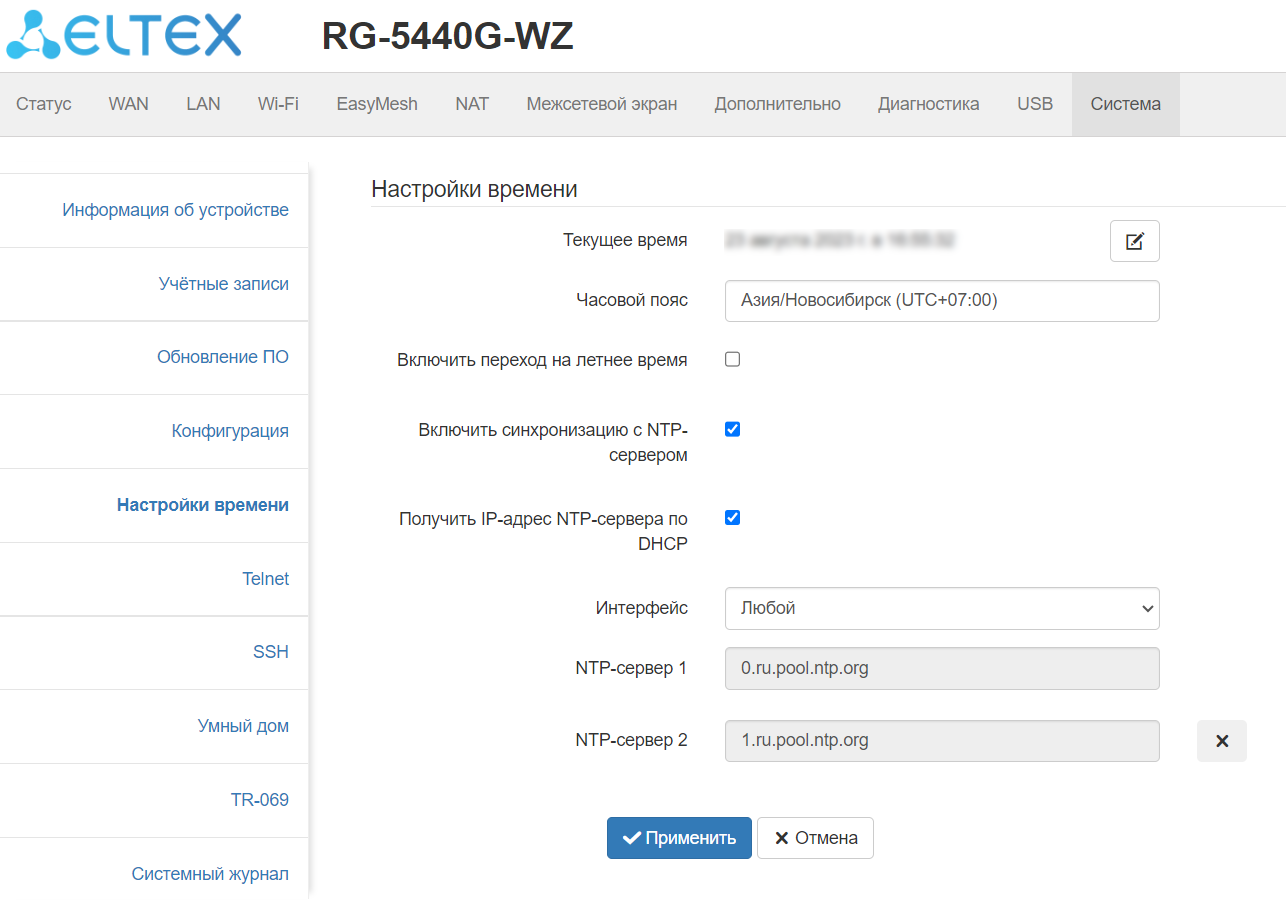 В этом подменю настраивается дата и системное время устройства при помощи синхронизации с NTP-сервером.