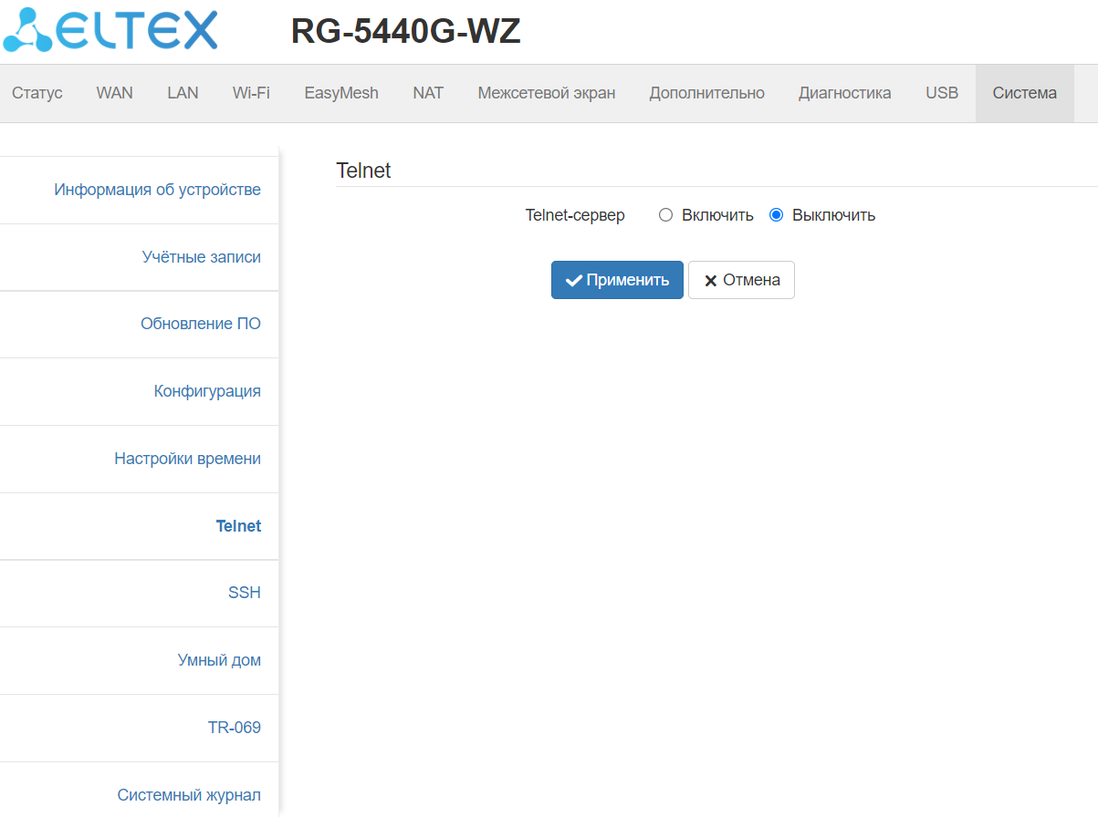 Данное подменю позволяет активировать/деактивировать функционал сервера Telnet на устройстве.