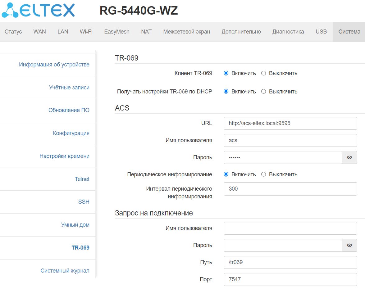 Подменю «Настройка TR-069» доступно только под учетной записью Администратор.