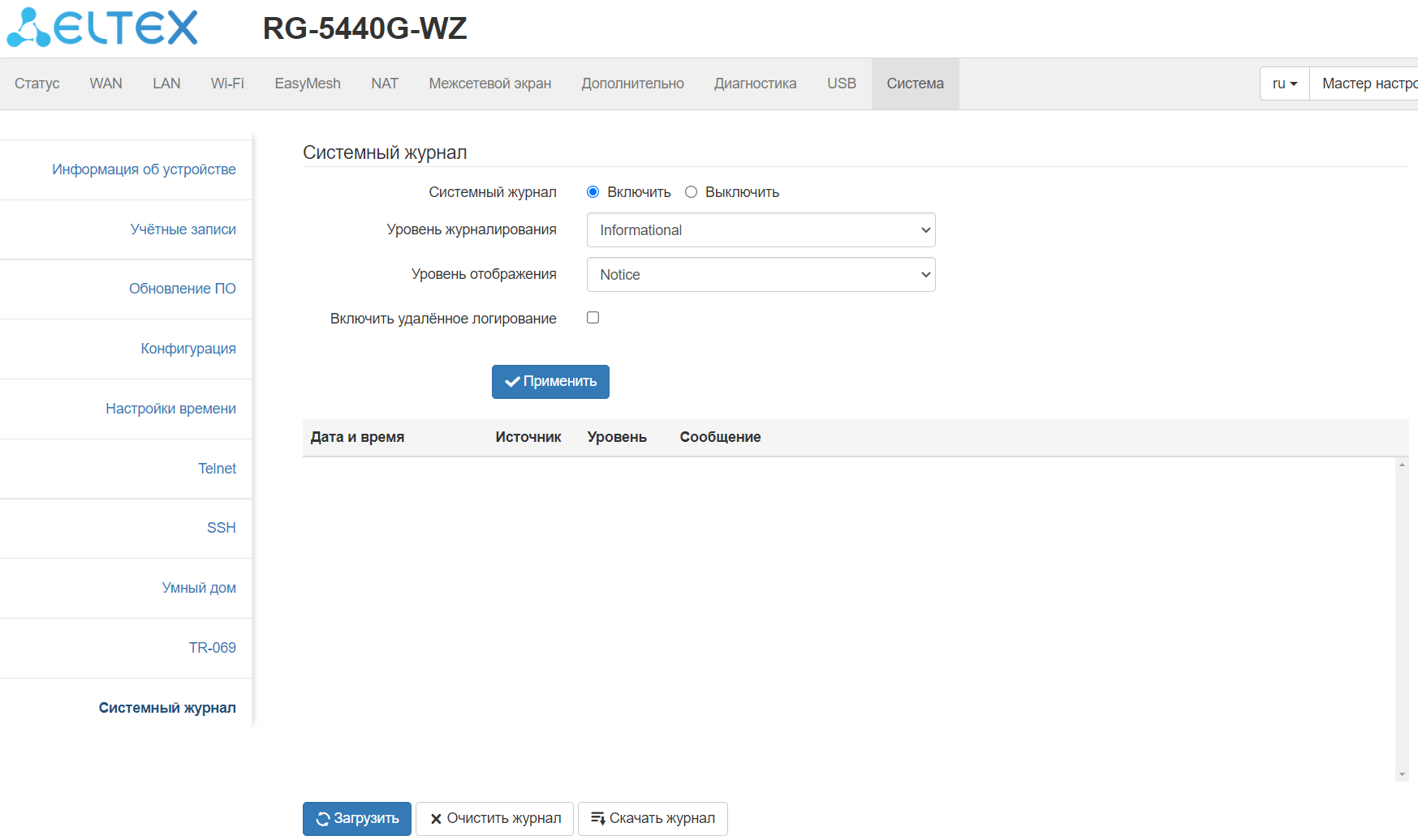 Скачать журнал — загрузить текущий системный журнал на устройство в текстовом формате.