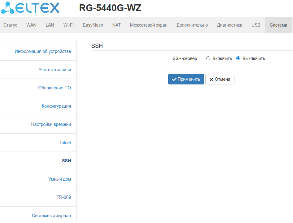 Данное подменю позволяет активировать/деактивировать функционал сервера SSH на устройстве.