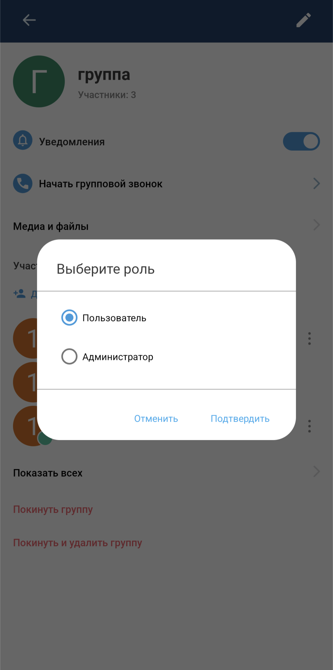 Для того чтобы изменить роль участника, откройте интерфейс информации о чате (см. раздел «Интерфейс информации о чате»), нажмите на кнопку вызова меню напротив нужного пользователя в списке, выберите Изменить роль, выберите новую роль и нажмите Подтвердить.
