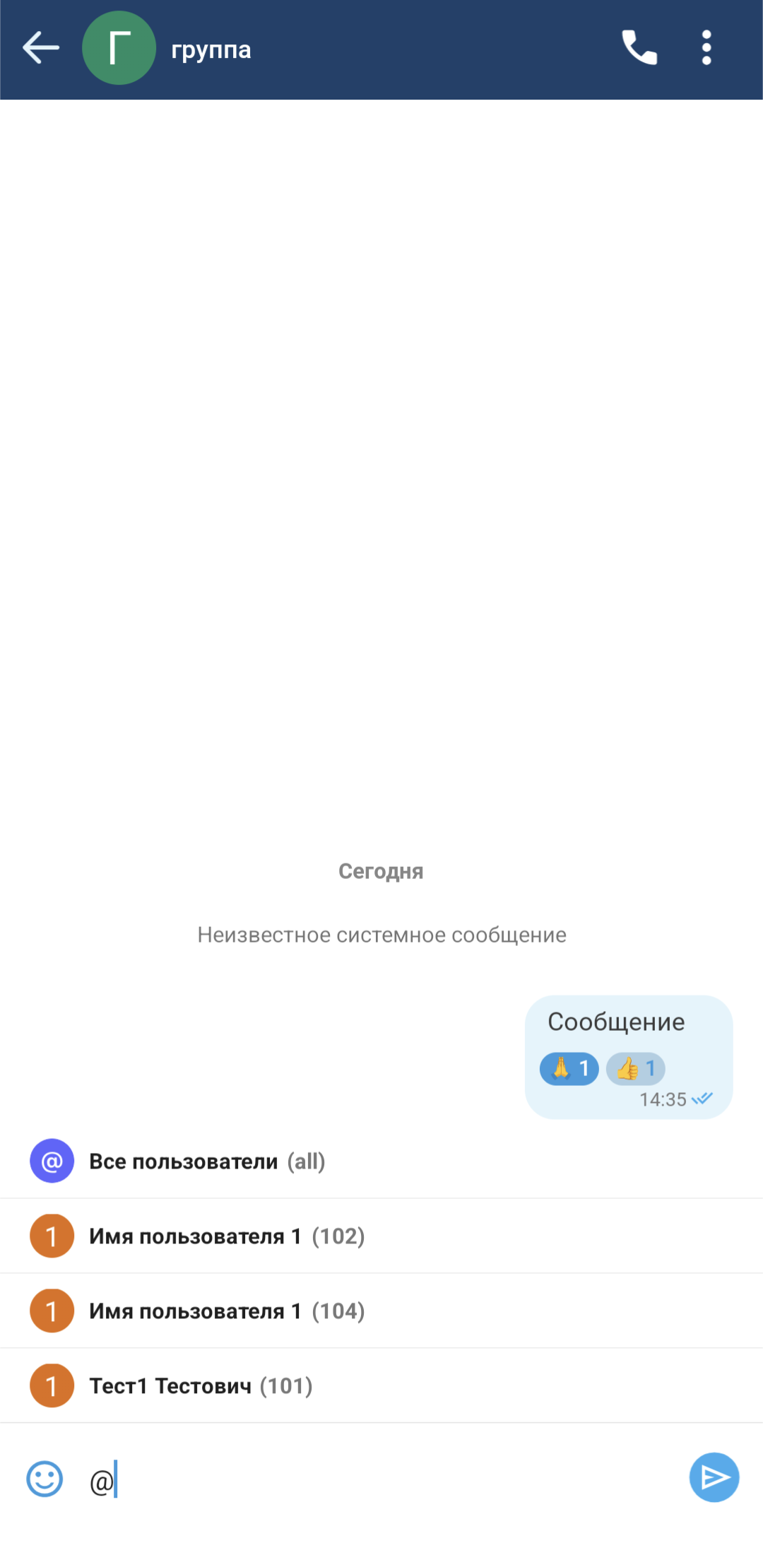 При нажатии на пользователя из списка он будет отмечен для добавления в групповой чат, а в верхней части интерфейса отобразится список всех отмеченных пользователей. При дальнейших нажатиях на других пользователей они будут отмечаться в списке и появляться в верхней части интерфейса в списке всех отмеченных. Для удаления отметки с пользователя можно повторно нажать на него в списке всех пользователей, либо нажать на него в списке отмеченных пользователей.