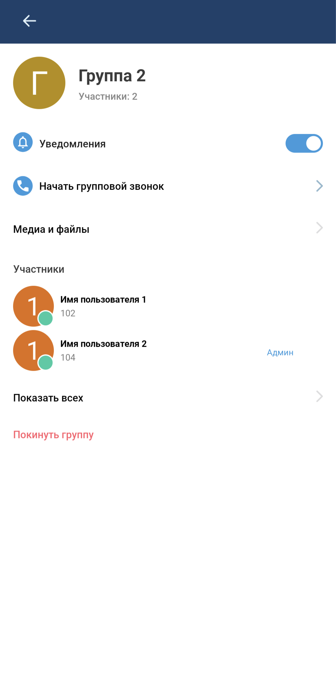 - кнопку Начать групповой звонок (см. раздел «Вызовы из чатов»);