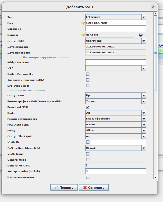 5. В SoftWLC.EMS создать SSID привязки к контроллерам Cisco. Привязки могут быть созданы на локацию, то есть географический домен.