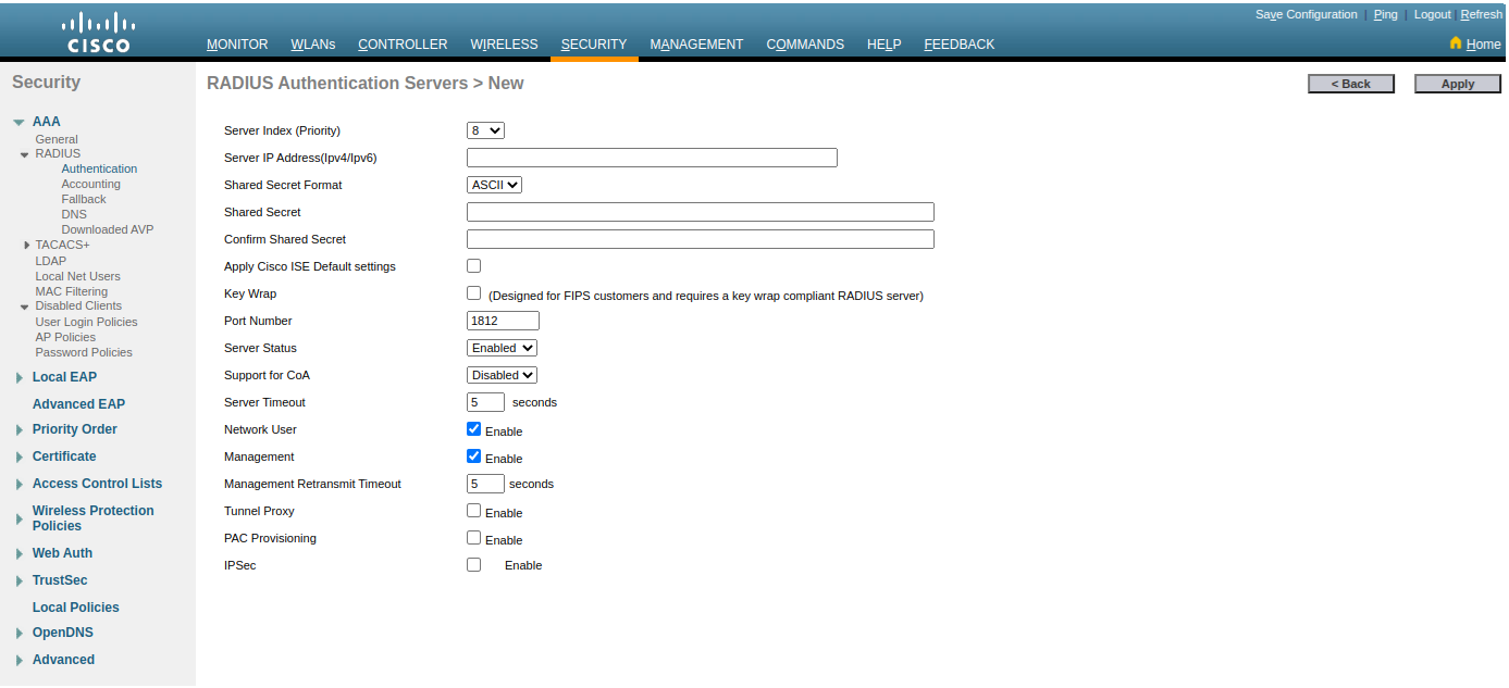 1. Добавить RADIUS сервер. Для работы с аккаунтингом и получением статистики по пользователю в настройках Cisco контроллера  в качестве  адреса RADIUS сервера будет выступать сервис eltex-pcrf. Пакет SoftWLC PCRF доработан таким образом, чтобы найти сервисный домен пользователя и провести аутентификацию стандартными способами SoftWLC.  SoftWLC PCRF ищет сервисные домены и подставляет их в RADIUS пакет, на основании уже присутствующих атрибутов NAS IP и названию SSID.