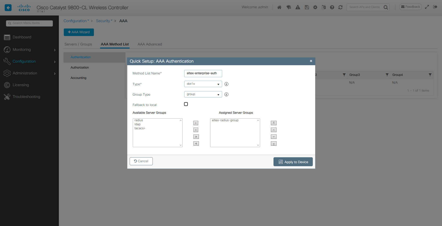 • Перейти в раздел "Configuration" → "Security" → "AAA" → "AAA Method List" → "Authentication"