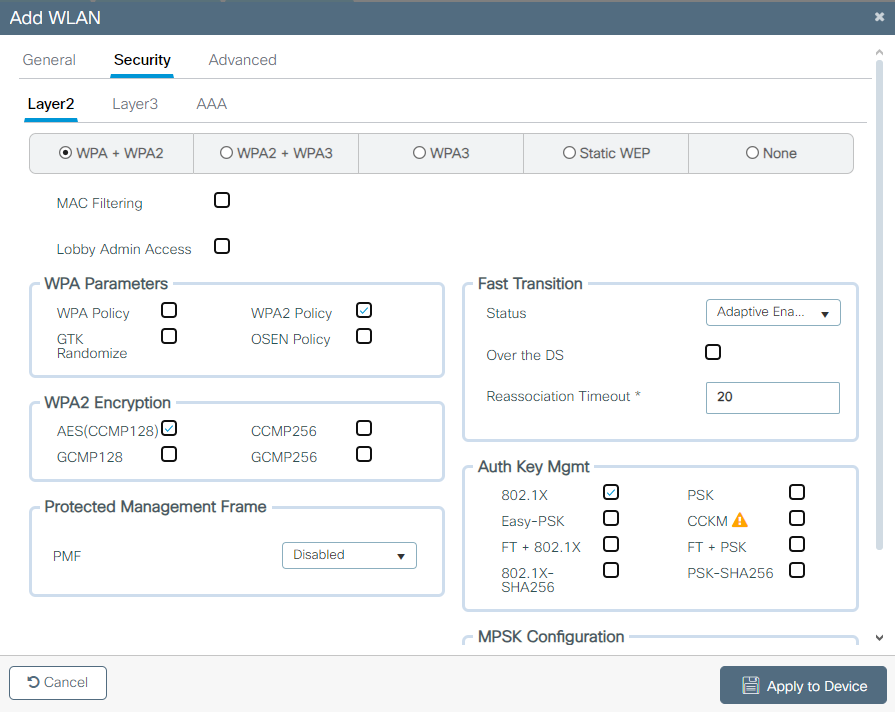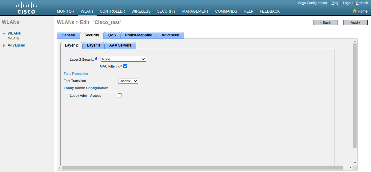 В случае когда необходимо использовать MAC авторизацию – установить значение None и чекбокс MAC Filtering.