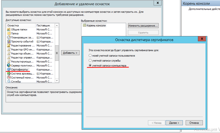 Перейдите на RADIUS-сервер, запустите mmc добавьте оснастку «Сертификаты» для локального компьютера,