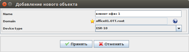 2. В открывшемся окне выбираем домен правила, вводим название - "default" (название можно ввести любое, данное просто означает, что будем использовать правило в дефолтной привязке инициализации), "device type" уже будет выбрано ESR-10 и нажимаем "Принять".