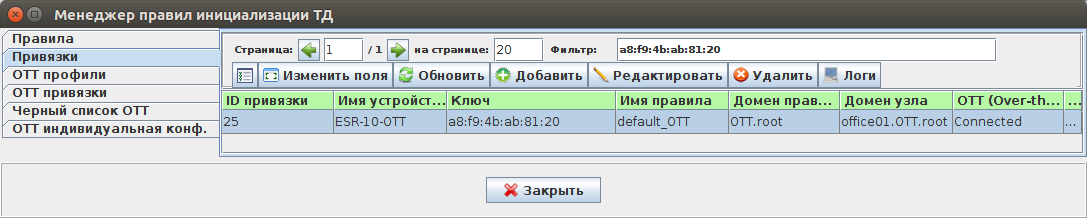 6. В "Менеджере правил инициализации ТД" переходим в "Привязки" и выбираем дефолтную привязку OTT (предполагается, что она уже была настроена ранее, при настройке подключений ТД OTT):