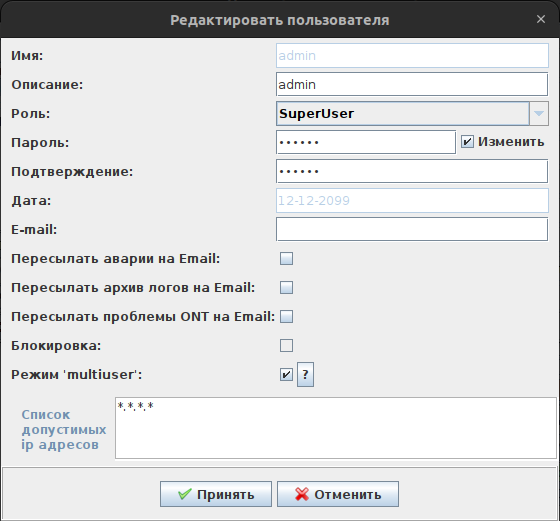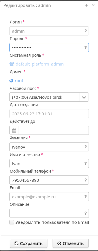 Переходим на пользователя admin (SuperUser) → Редактировать. В открывшемся окне устанавливаем флаг "Изменить" и указываем новый пароль с подтвержением