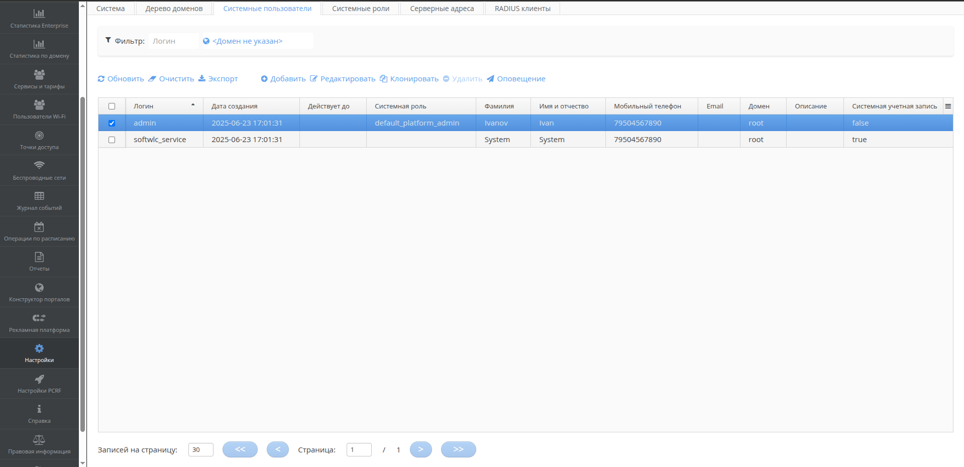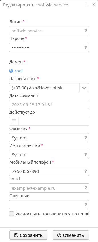 Переходим в "Настройки" → "Системные пользователи". Устанавливаем флаг напротив учетной записи с логином"softwlc_service" и нажимаем кнопку "Редактировать".