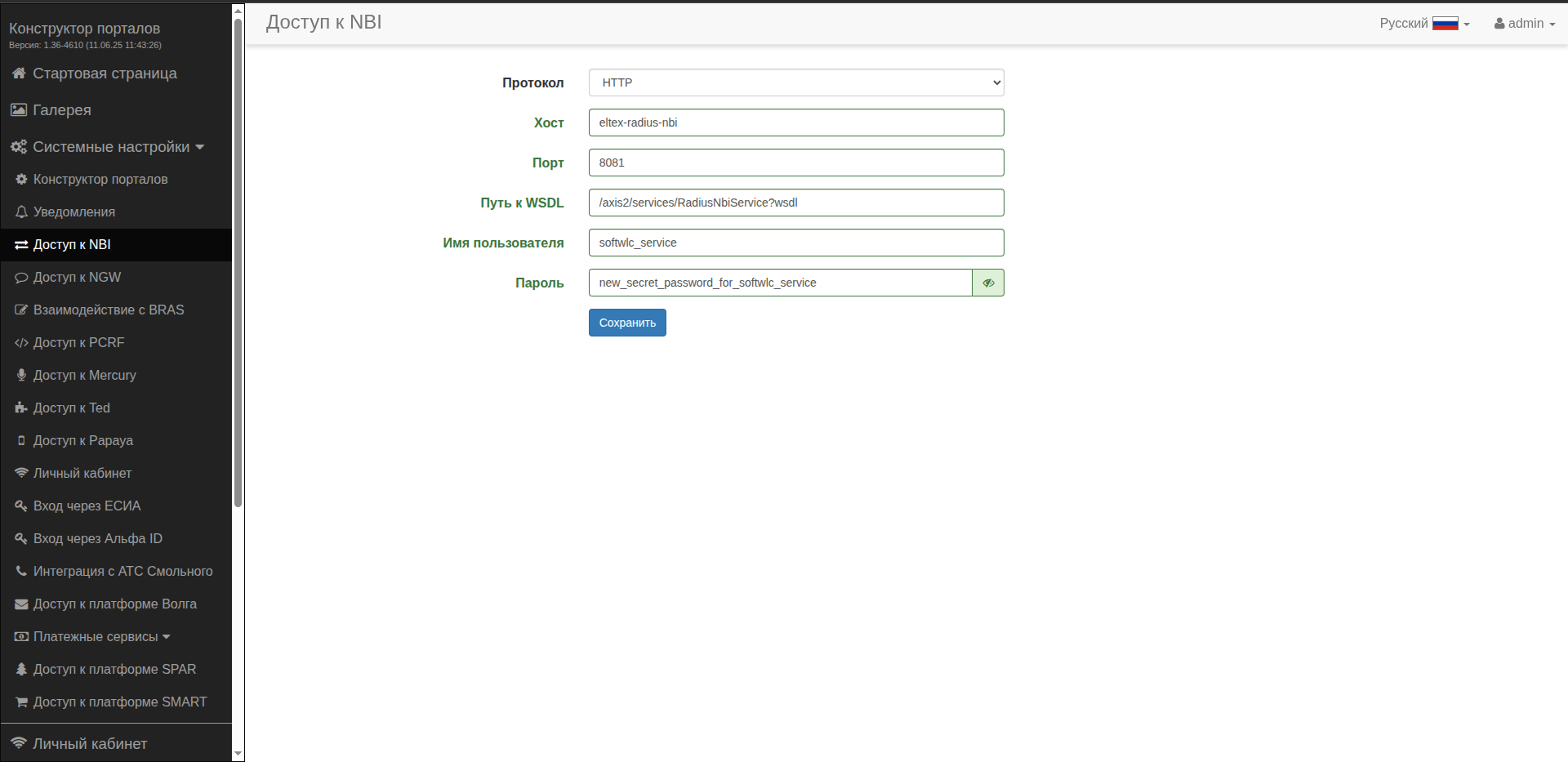 После входа переходим в раздел Системные настройки → Доступ к NBI. В открывшемся окне для пользователя "softwlc_service" изменяем пароль на идентичный паролю в Личном кабинете и нажать кнопку "Сохранить".