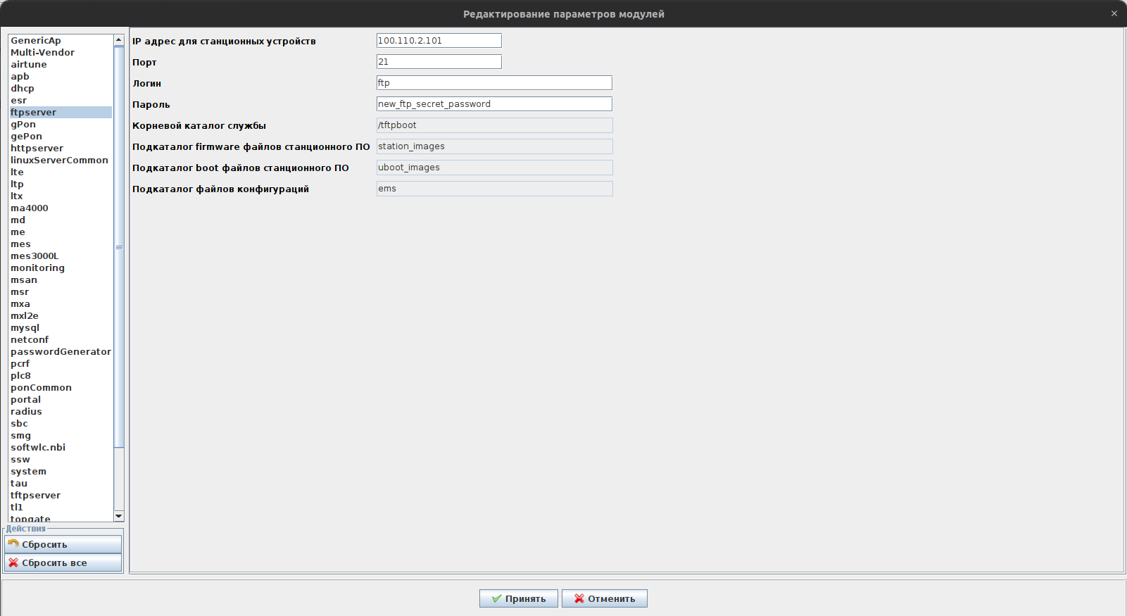 Выбираем модуль "ftpserver". В открывшемся окне для пользователя "ftp" нужно изменить пароль на идентичный паролю указанному в all.yml и нажать кнопку "Принять".