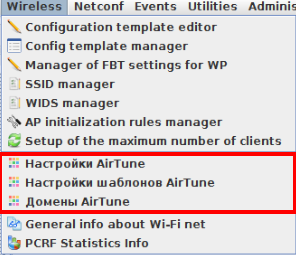 Если лицензия на Airtune присутствует в списке, то в GUI EMS  в меню "Wireless" будет доступна для настройки вкладки Конфигурации сервиса, изображенные на скриншоте: