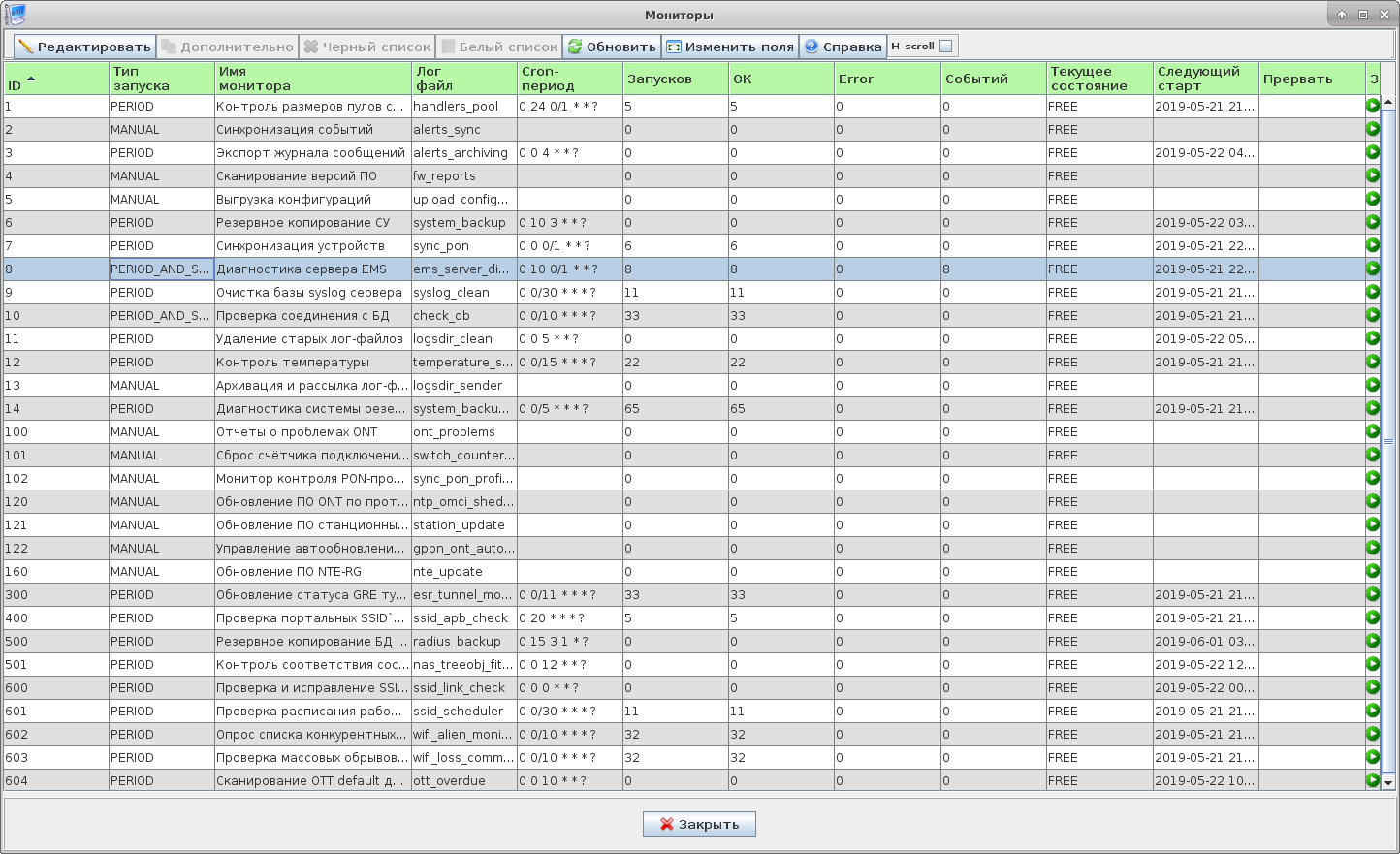 Зайдите в меню Администрирование/Настройка сервера/Задачи по расписанию (мониторы), выберите монитор Диагностика сервера EMS ID=8 и нажмите кнопку "Редактировать".